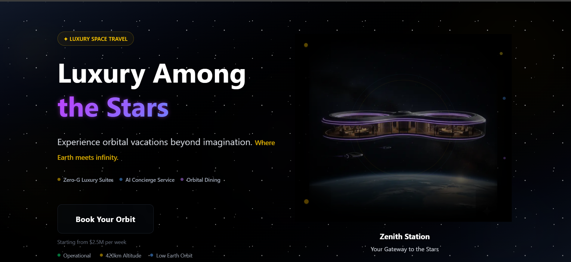 Modern space tourism booking platform with stunning visual design, smooth animations, and immersive user experience. Features destination exploration and booking interface.
